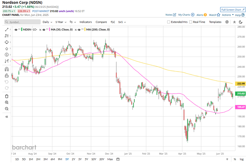 Nordson’s stock surged 6.8% following the release of its Q2 2025 results on May 28. Quarterly sales rose 5% year-over-year to $683 million, surpassing Wall Street expectations, primarily driven by an 8% contribution from the Atrion acquisition. The company delivered strong adjusted EBITDA of $217.2 million, with a robust margin of 32%, reflecting continued operational excellence and gains from acquisitions. Meanwhile, adjusted EPS increased 3.4% from the prior-year quarter to $2.42, beating the consensus estimate.