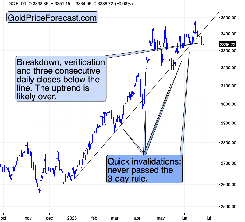 Yesterday marked the third consecutive daily close below this rising support line and since gold is not rallying today (and neither is silver), it seems that we’ll get a fourth daily close below it soon. Gold is still holding above $3,300 per ounce, but it might not be for long.