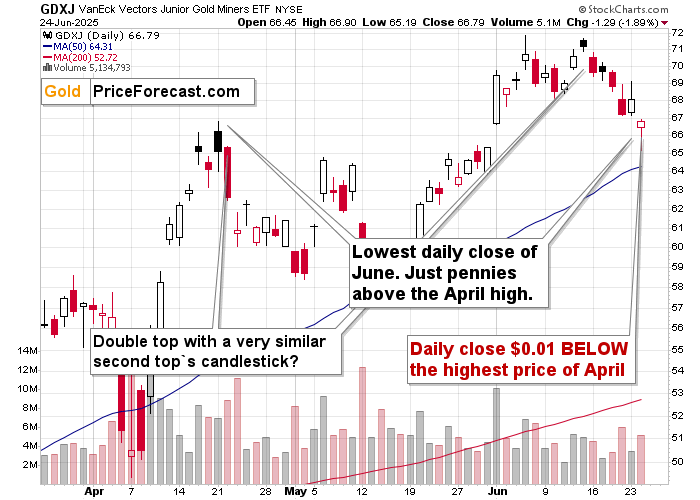Plus, this ETF closed $0.01 (but still) below its highest April price. We still have several days left before the end of the month and given that gold is now declining almost regardless of what’s going on in the world, it seems quite likely that we’ll see GDXJ in the red in June.