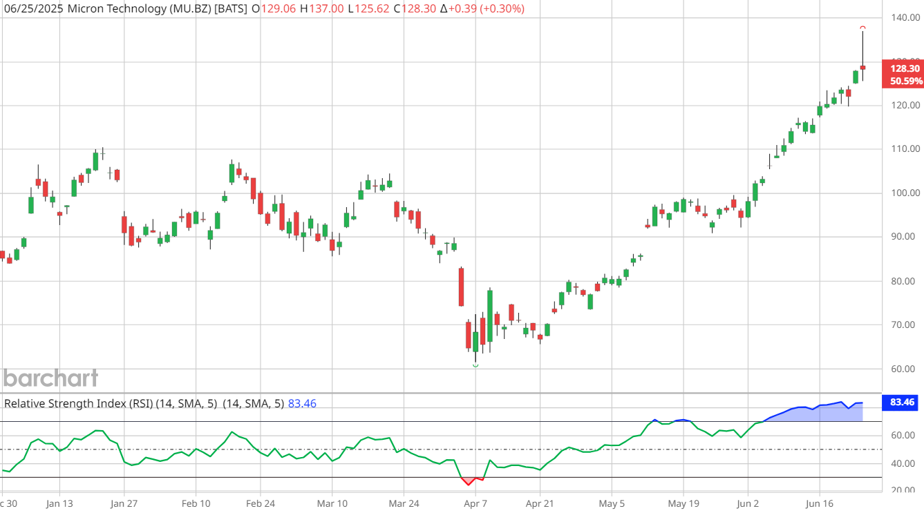 Micron Technology (MU) popped higher in after-hours trading following its exceptional fiscal third-quarter 2025 results - but the stock has quickly pared the bulk of its late gains, and is up just 0.5%. Heading into tonight’s report, MU stock had surged more than 36% over the past month, and the 14-day Relative Strength Index (RSI) of 83 was deep in overbought territory. That means the shares could be vulnerable to a short-term technical reversal, despite the strong earnings.