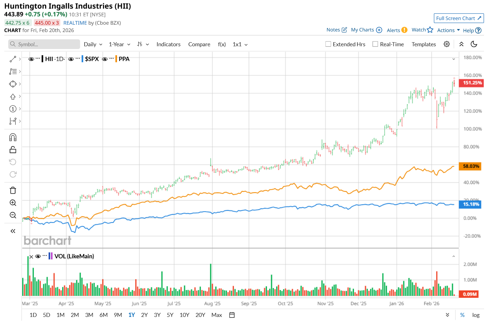 Zooming in further, HII has also notably outpaced the Invesco Aerospace & Defense ETF (PPA), which soared 54.9% over the past 52 weeks and 15.3% on a YTD basis.