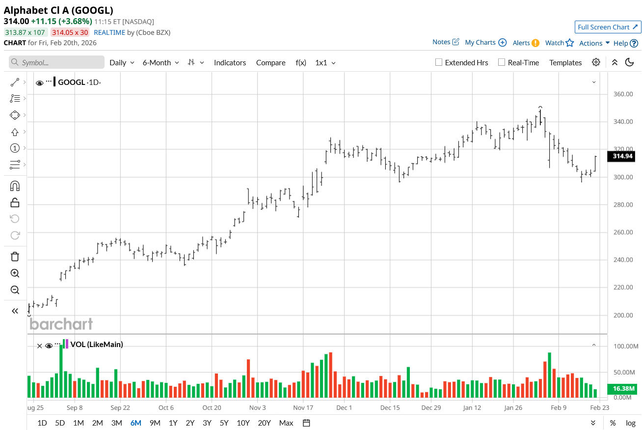 Alphabet's stock shows signs of a little short-term weakness amid concerns about AI spending. The five-day performance is up just 1.6%, one month is down 2.3%, but six months soared 57%; year-to-date (YTD) is just about flat, and 52-week is up 69% from $142.66 lows to $350 highs, and beta 1.09 tracks market swings.