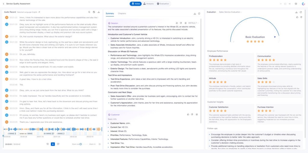 Echo’s AI-powered conversation summaries and service intelligence assessments enable rapid understanding of customer needs and comprehensive optimization of the sales and service process, while its ability to audit sales performance and identify key customer feedback through voice interaction data drives enhanced efficiency and actionable insights for enterprises.