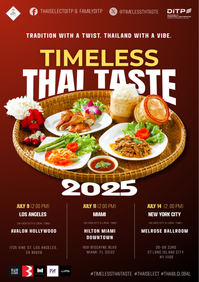 The Department of International Trade Promotion (DITP), under the Ministry of Commerce, is set to launch “Timeless Thai Taste 2025,” a landmark initiative aimed at advancing Thailand’s creative economy through the strategic deployment of cultural soft power. By uniting the culinary excellence of Thai cuisine with the global appeal of Thai entertainment, the campaign seeks to build brand awareness and boost export value in the United States. The program will roll out from July 9–14, 2025, across three key American cities: Los Angeles, Miami, and New York.