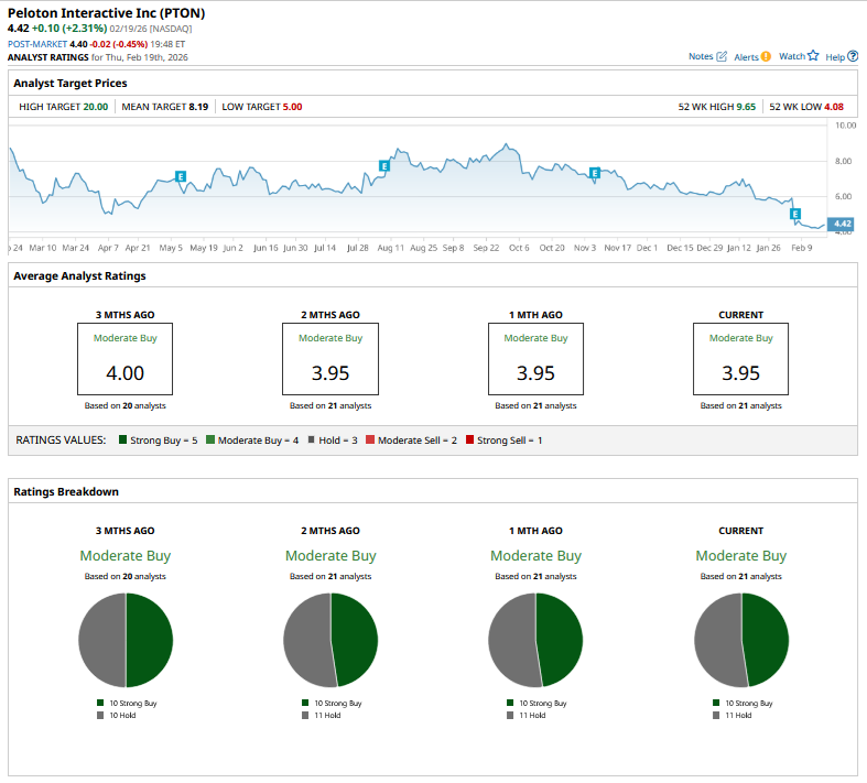 Brokerage did not take kindly to Peloton’s fiscal Q2 earnings, and analysts at Citigroup, J.P. Morgan, Truist, and Telsey lowered their target prices. Argus went a step further and downgraded the stock from a “Buy” to a “Hold.” Overall, analysts are quite divided on Peloton’s outlook, and roughly half of those covering the stock rate it as a “Strong Buy,” while the remaining half rate it as a “Hold.” The stock even trades below its Street low target price of $5, while the mean target price of $8.19 is over 85% higher.