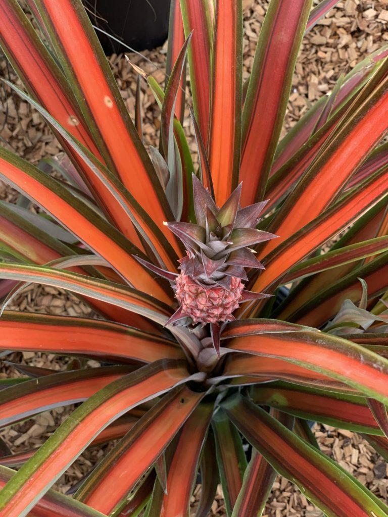 - Colorful appearance – Red-pink pineapples and variegated green leaves