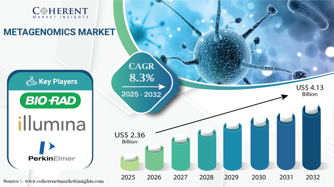 According to a recent report by Coherent Market Insights, the global Metagenomics Market is estimated to be valued at USD 2.36 Bn in 2025 and is expected to reach USD 4.13 Bn by 2032, exhibiting a compound annual growth rate (CAGR) of 8.3% from 2025 to 2032. The growing use of metagenomics across diverse industries such as healthcare and biotechnology is expected to drive market growth. Metagenomics offers a wide range of applications, including gene identification for disease treatment, microbiome analysis, biofuel production, and environmental cleanup. Additionally, advancements in sequencing technologies and declining sequencing costs are projected to support the expansion of the metagenomics sector. Increasing global research efforts in this field are also anticipated to further boost market growth during the forecast period.