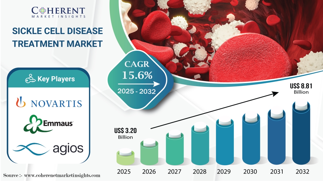 According to Coherent Market Insights (CMI), the global sickle cell disease treatment market size is expected to expand from USD 3.20 Bn in 2025 to USD 8.81 Bn by 2032, recording a CAGR of 15.6% during the assessment period.
