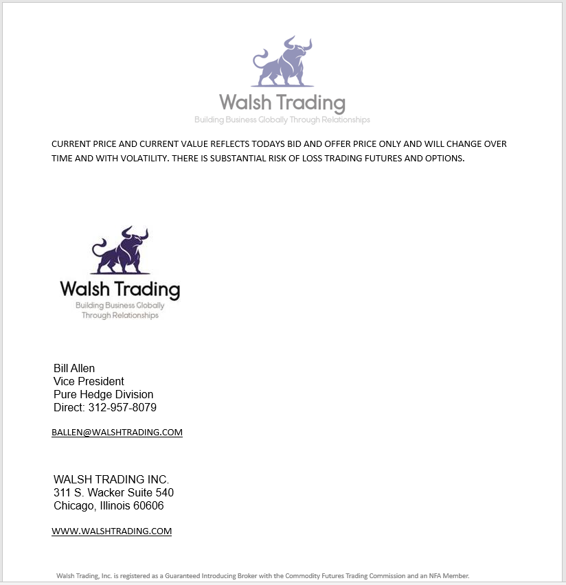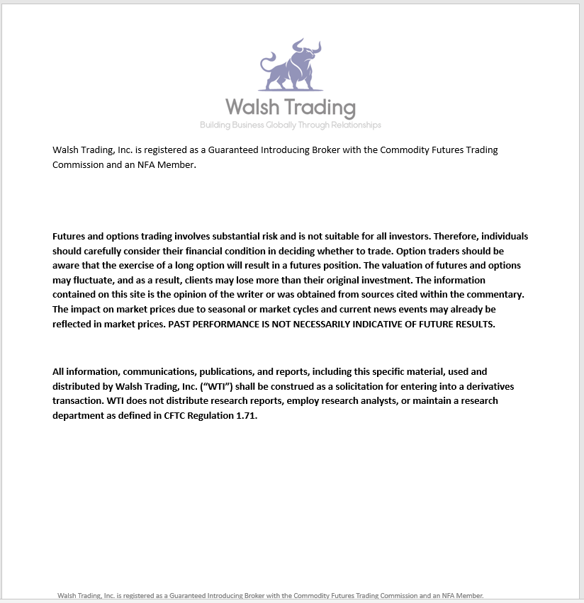 All information, communications, publications, and reports, including this specific material, used and distributed by Walsh Trading, Inc. (“WTI”) shall be construed as a solicitation for entering into a derivatives transaction. WTI does not distribute research reports, employ research analysts, or maintain a research department as defined in CFTC Regulation 1.71.