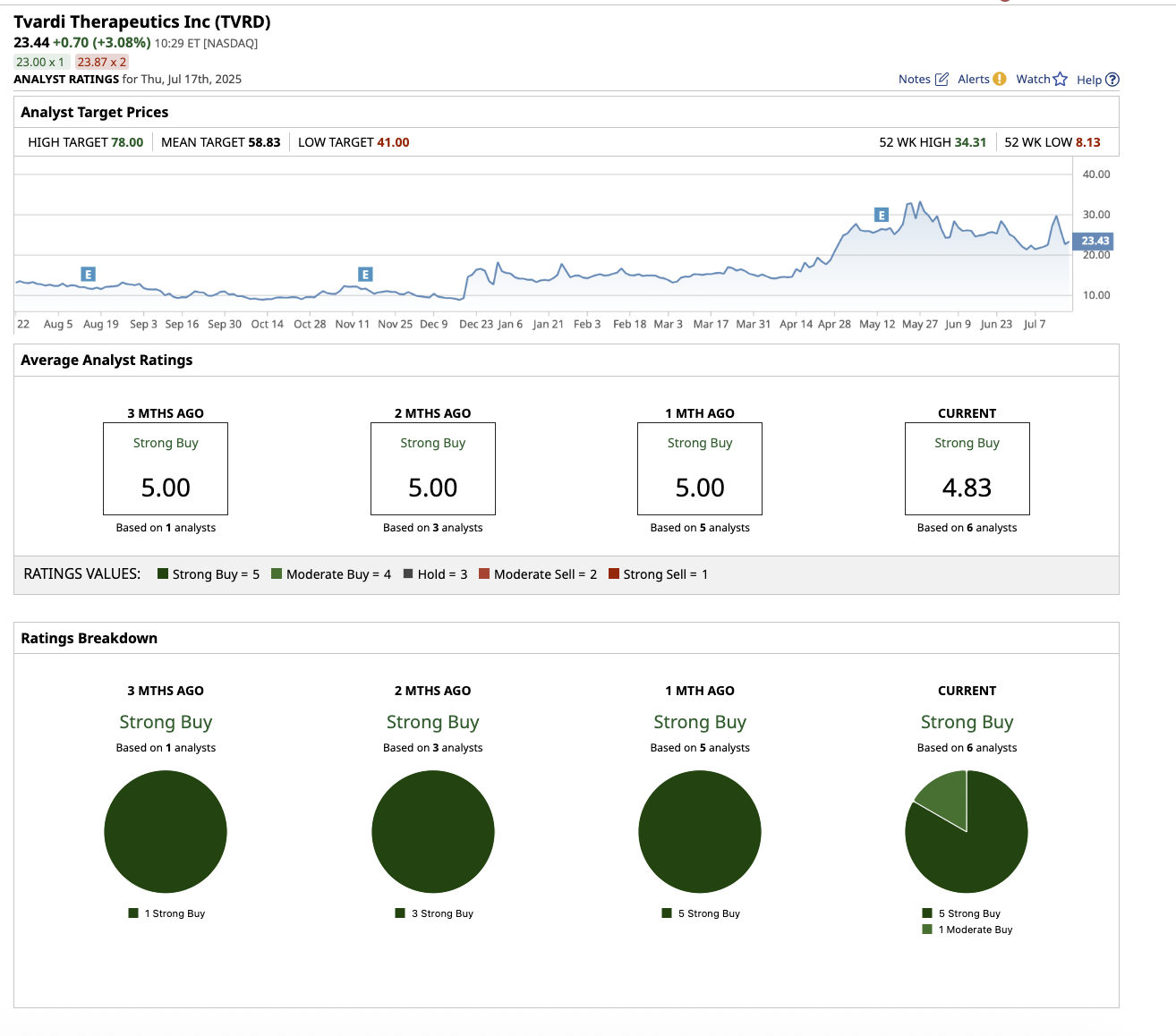 Of the six analysts covering TVRD stock, five of them rate it as a “Strong Buy,” with one suggesting a “Moderate Buy.” The average price target is $58.33, which represents 151% upside from current levels. Its high target price of $78 implies the stock can surge 233% over the next 12 months.