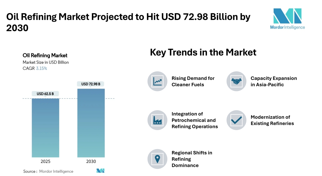 According to a 2025 report on the Oil Refining Market by Mordor Intelligence, the market is projected to reach USD 72.98 Billion by 2030, growing at a CAGR of 3.15% during the forecast period. The report provides comprehensive insights into the structural, technological, and regulatory developments shaping the oil refining sector worldwide.
