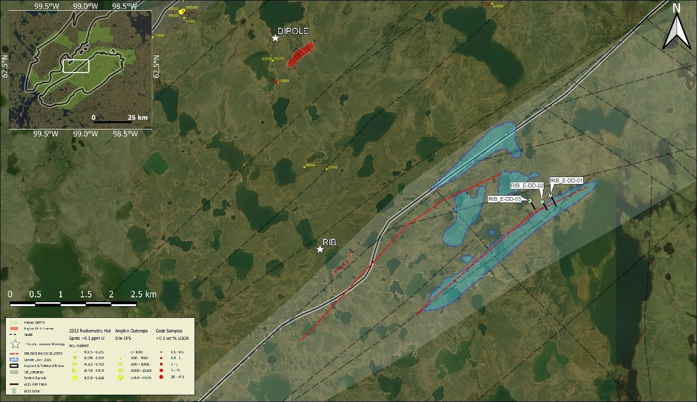 Troy Boisjoli, CEO commented: " The RIB East Discovery represents the second new discovery (first being KU Discovery) during the 2025 Angilak Exploration Program, beyond the Lac 50 Deposit Trend in the Angikuni Basin. These results continue to confirm the Company's exploration approach and thesis, while demonstrating our technical team's ability to execute and discover. The Company is thrilled with the fact that the RIB East Discovery has high-grade mineralization hosted within a graphitic structure - a known setting for mineralization in all major Athabasca Basin deposits and mines. We are at the early stages of understanding the potential of RIB East, with drilling covering just 400 m of a 2 km long anomaly. The early successes of the 2025 Angilak Exploration Program truly illustrate how underexplored and robust the mineralizing system is in the Angikuni Basin."