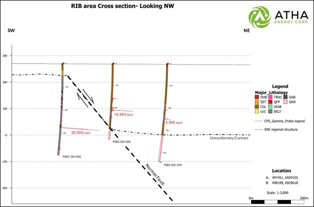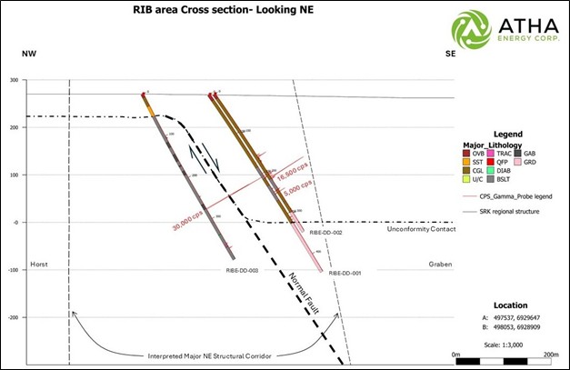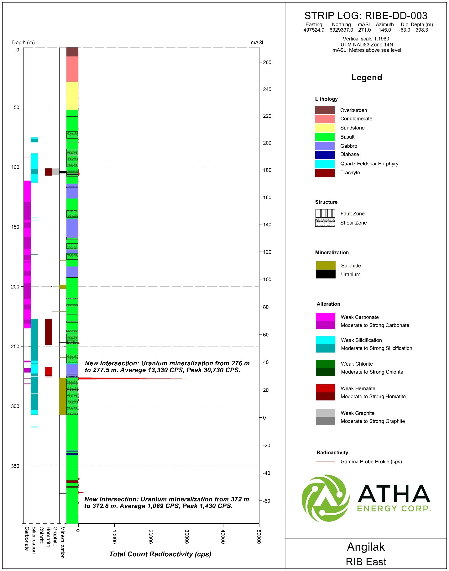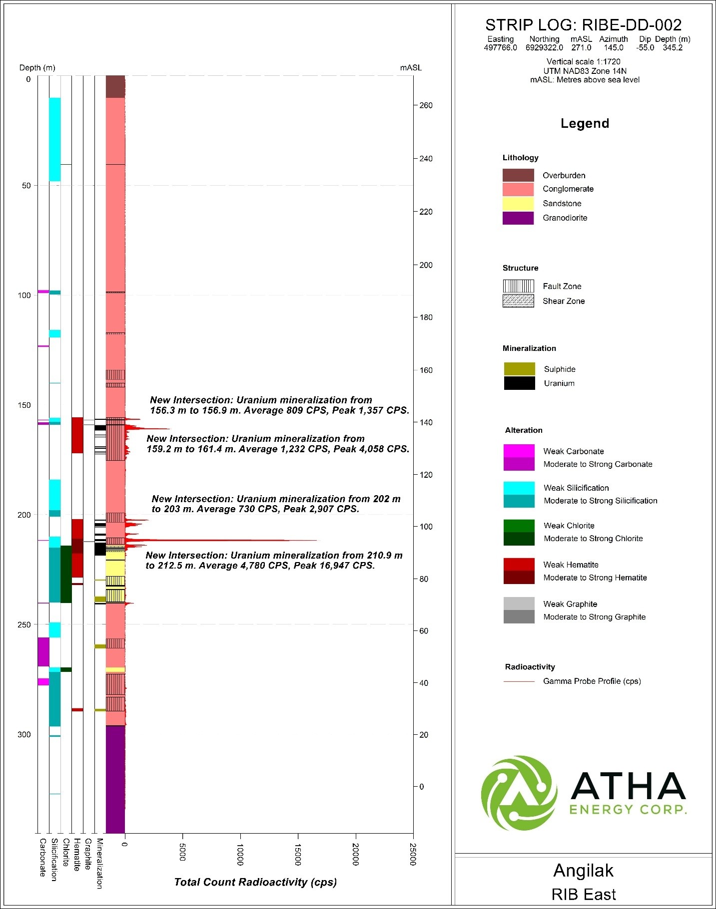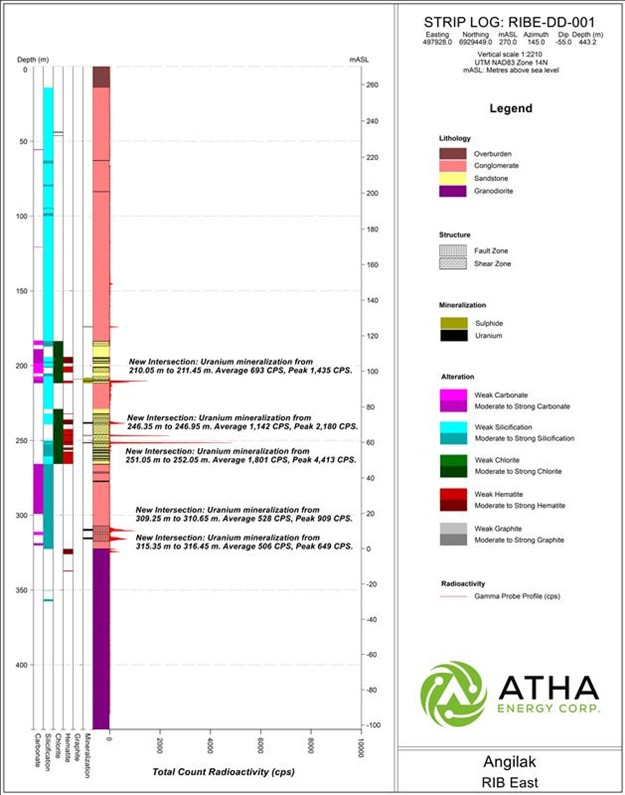VANCOUVER, BC / ACCESS Newswire / July 21, 2025 / ATHA Energy Corp. (TSX.V:SASK)(FRA:X5U)(OTCQB:SASKF) (" ATHA " or the " Company "), is pleased to announce results for the first three diamond drill holes completed at the RIB East target as part its 2025 Angilak diamond drill exploration program at its 100%-owned Angilak Uranium Project, Nunavut. The maiden drill hole at RIB East Target intersected six zones of uranium mineralization, totaling 5.9 m of composite mineralization (Figures 3a, b & 4). The second hole was designed to test 200 m along strike to the southwest of RIBE-DD-001, where the hole intersected broader zones of uranium mineralization. These include a shallow continuous (210.9 m to 212.5 m) zone with high-grade mineralization over 0.3 m with maximum readings of 16,947 CPS 1 . The third drill hole, RIBE-DD-003, was a 150 m step back by 200 m along strike test of a parallel stacked gravity-EM anomaly. The hole intersected composite mineralization of 2.1 m with continuous shallow mineralization over a 1.5 m interval, including a 1.0 m continuous high-grade (>10,000 CPS) and a lower grade fracture intersected at 372 m. RIB East is currently defined by 2-km long by 500 m wide gravity anomaly with coincident NE to SW conductors. RIB East is located ~1.5 km within the Angikuni Basin and ~2 km to the northeast of the historic RIB Discovery.