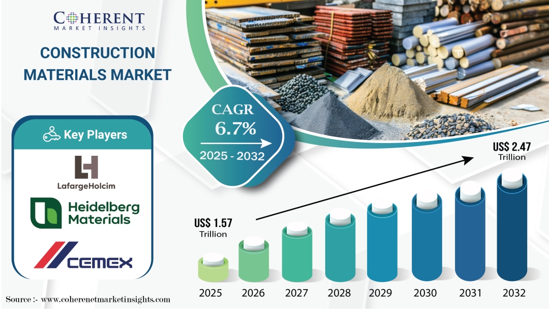 According to Coherent Market Insights (CMI), the global construction materials market size is projected to reach a whooping USD 2.47 Tn by 2032, up from USD 1.57 Tn in 2025.