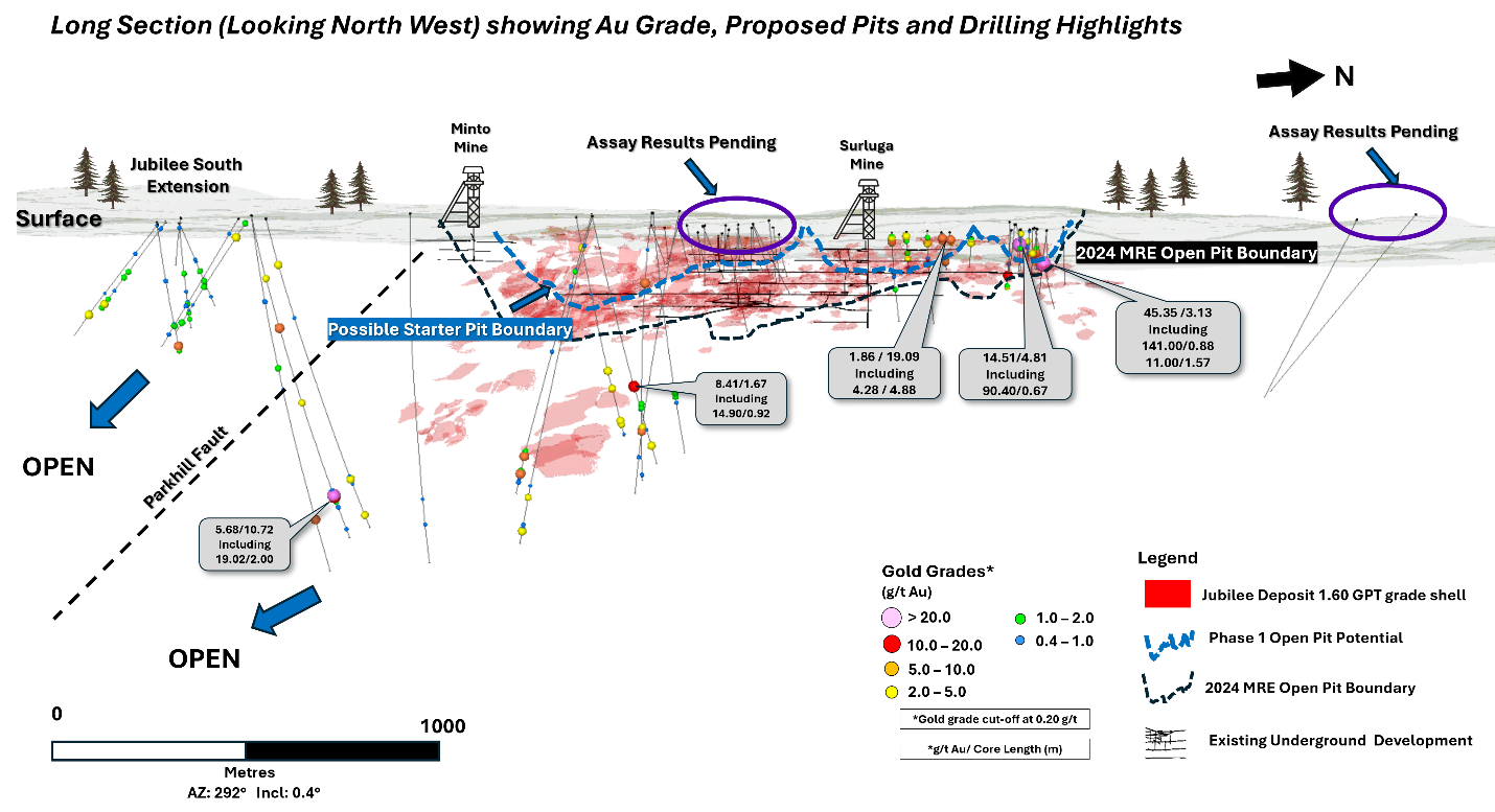 Figure 1: Longitudinal section (looking west) showing the gold mineralization in red grading greater than 1.6 g/t Au, several select assay results from recent drilling, and the 2024 MRE open pit shell and potential starter pit shells.