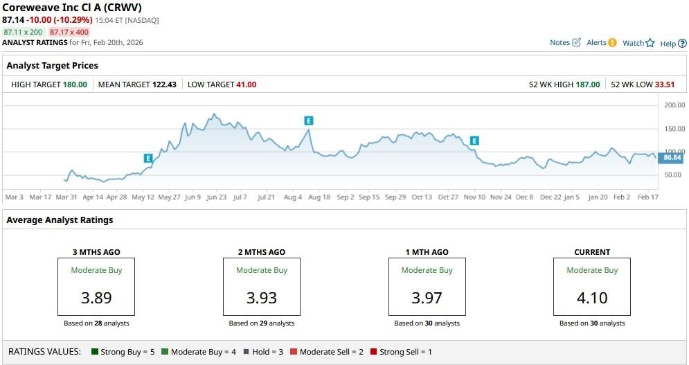 The consensus rating on CoreWeave sits at “Moderate Buy” currently with the mean target of about $122 indicating potential upside of roughly 40% from here.