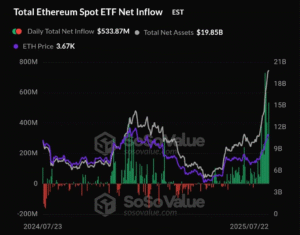 Ethereum’s price has retracted from recent highs, hovering around $3,650 currently as investors digest fresh data.