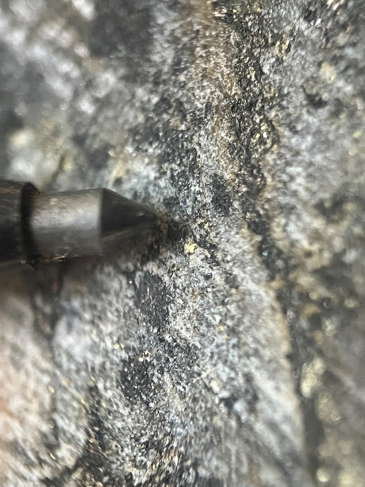 Figure 2. In situ sample A0514497 with visible gold mineralization hosted in a quartz manganese-carbonate vein with pyrrhotite, chalcopyrite and wolframite.