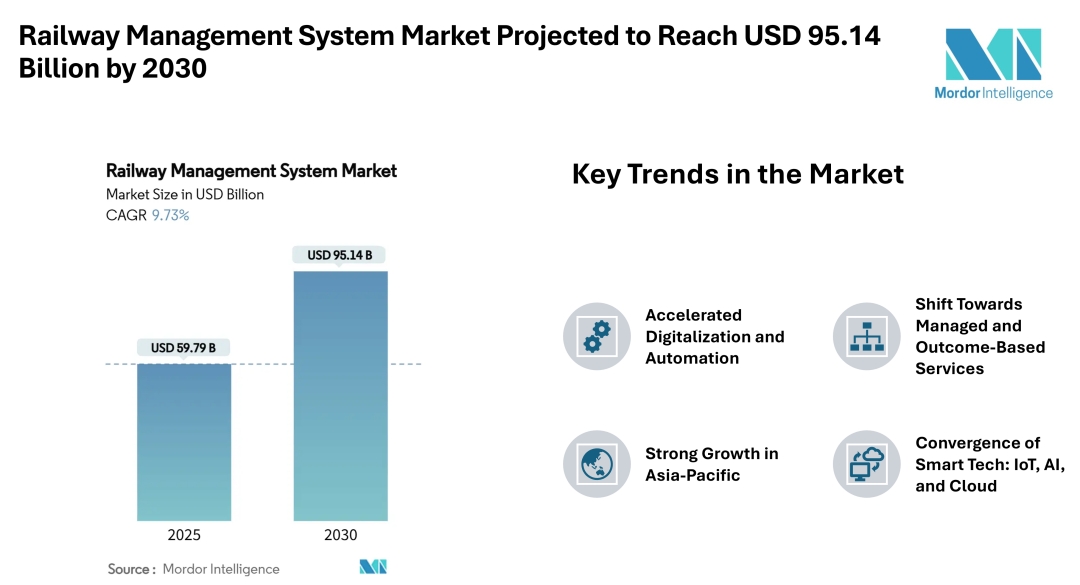 According to a 2025 report by Mordor Intelligence, the Railway Management System Market is valued at USD 59.79 billion in 2025 and is projected to grow to USD 95.14 billion by 2030, registering a compound annual growth rate (CAGR) of 9.73% over the forecast period. The rising demand for improved operational efficiency, real-time traffic control, and digitized services across railway networks is driving this expansion.