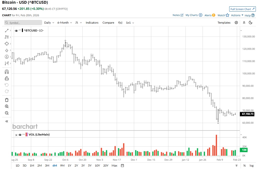 It’s been a roller coaster ride for Bitcoin (BTCUSD) investors in the last six months. The crypto asset touched all-time highs of $126,223 in October 2025. While market participants were expecting the bull run to sustain, Bitcoin reversed sharply and currently trades lower by 46.8% at $67,704.