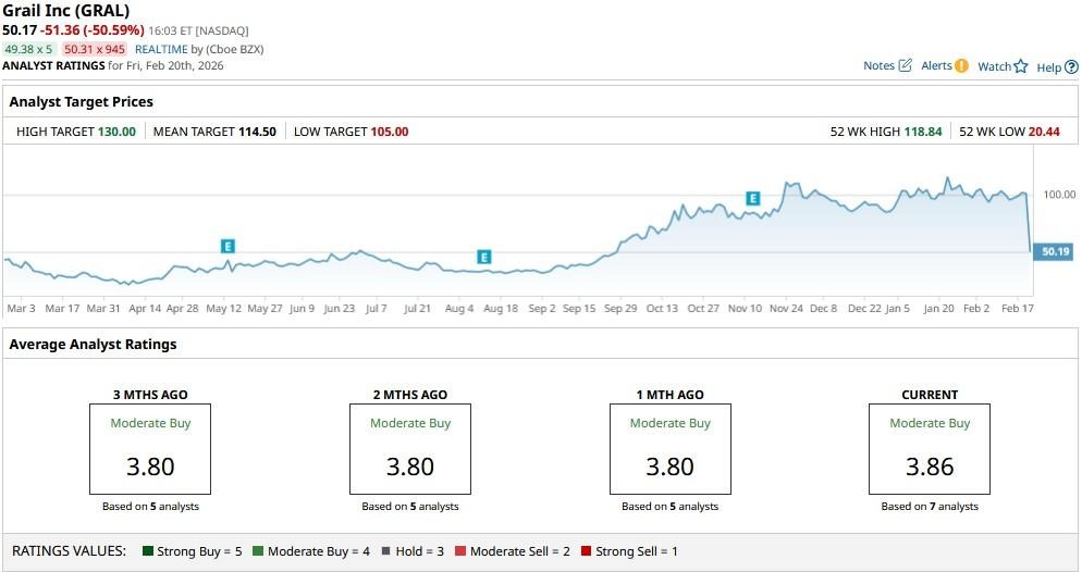 Heading into Friday, Wall Street analysts had a consensus “Moderate Buy” rating on GRAL shares with a mean target of about $114.