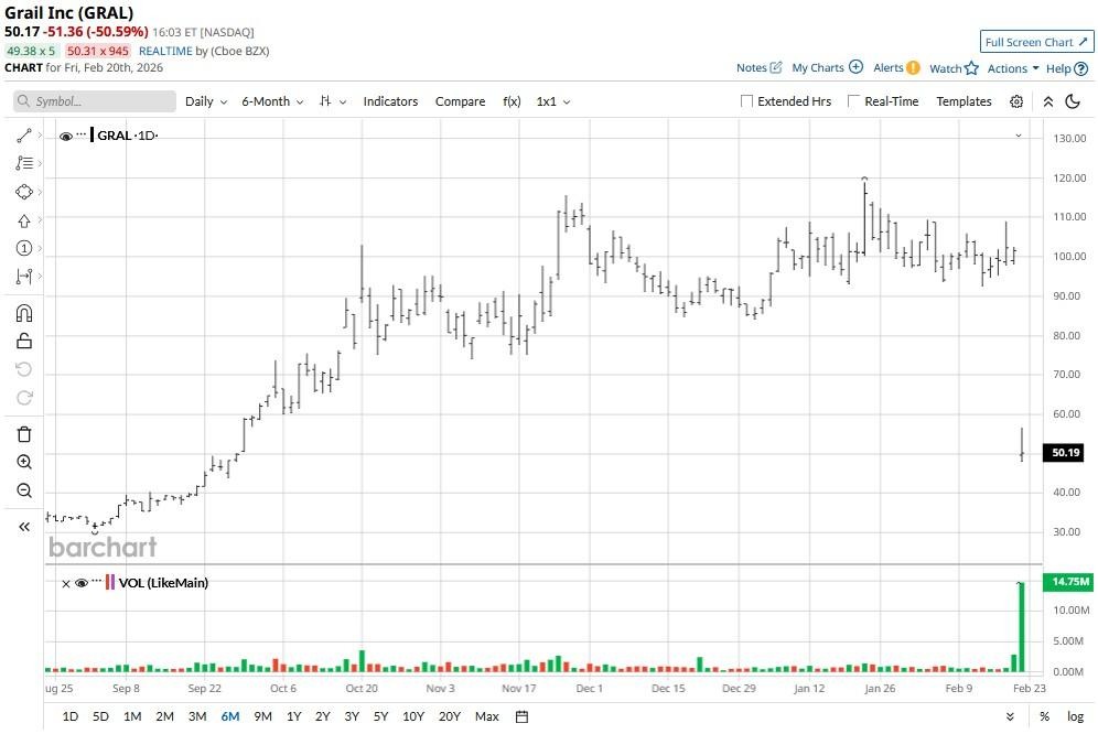 Grail (GRAL) shares were cut in half on Feb. 20 after the biotech firm said its highly anticipated NHS-Galleri clinical trial failed to meet its primary endpoint.