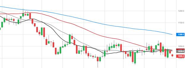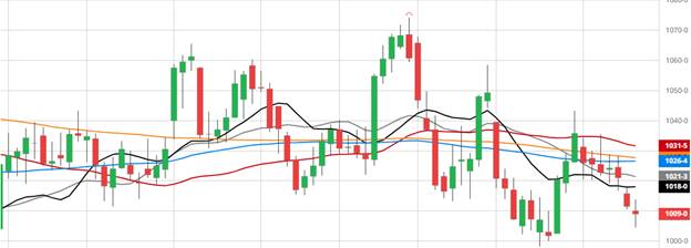 Looking at November beans on the weekly charts we have support at 998 ¼ which has been the month of July’s low then the April low of 971 ¼. The moving averages are coming at (1028 ¾) for the 21 day, 50 day (1033) 14 day (1033 ¾) and lastly the 100 day (1100) which we are using as resistance as well as last week’s high (1035 ¼) (see chart below).