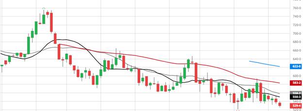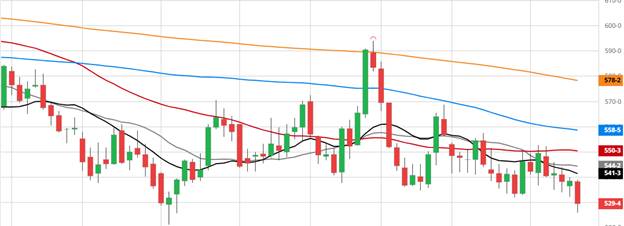 As far as resistance goes on the weekly charts for September wheat we have last week’s high at 552 ¾ and the weekly moving averages are coming in at (550 ¼) for the 14 day, the 21 day at (558 ¼) the 50 day (583 ¼) and lastly the 100 day at (622) (see chart below).