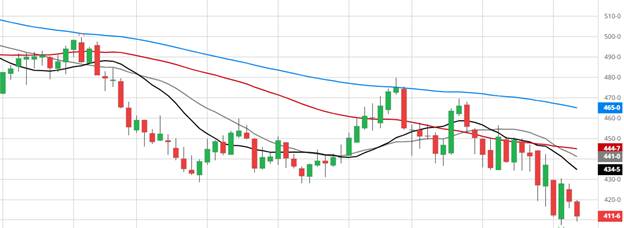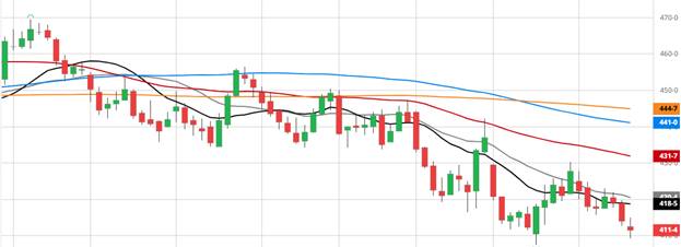 Looking at the longer-term charts we have support in December corn at 407 ½. With corn also making lower highs on the weekly charts as of late the market acts heavy. With resistance coming in at last month's high of (430 ¼) and the moving averages on the weekly’s coming in at (434 ½) for the 14 day (440 ¾) for the 21 day and lastly (444 ¾) for the 50 day (see chart below).