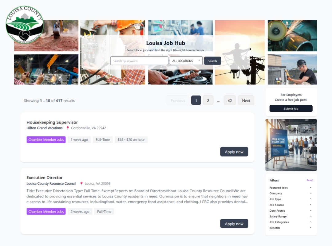The Louisa Job Hub provides a centralized, Chamber-supported destination for local job opportunities. Job listings are automatically aggregated from multiple sources and regularly updated, giving employers a simple way to expand visibility while offering job seekers a clear and efficient path to opportunities close to home.