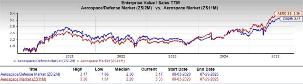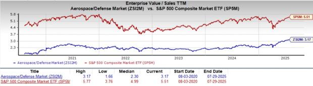 On the basis of the trailing 12-month EV/Sales ratio, which is used for evaluating capital-intensive stocks like aerospace-defense, the industry is currently trading at 3.17 compared with the S&P 500’s 5.51 and the sector’s 3.36.