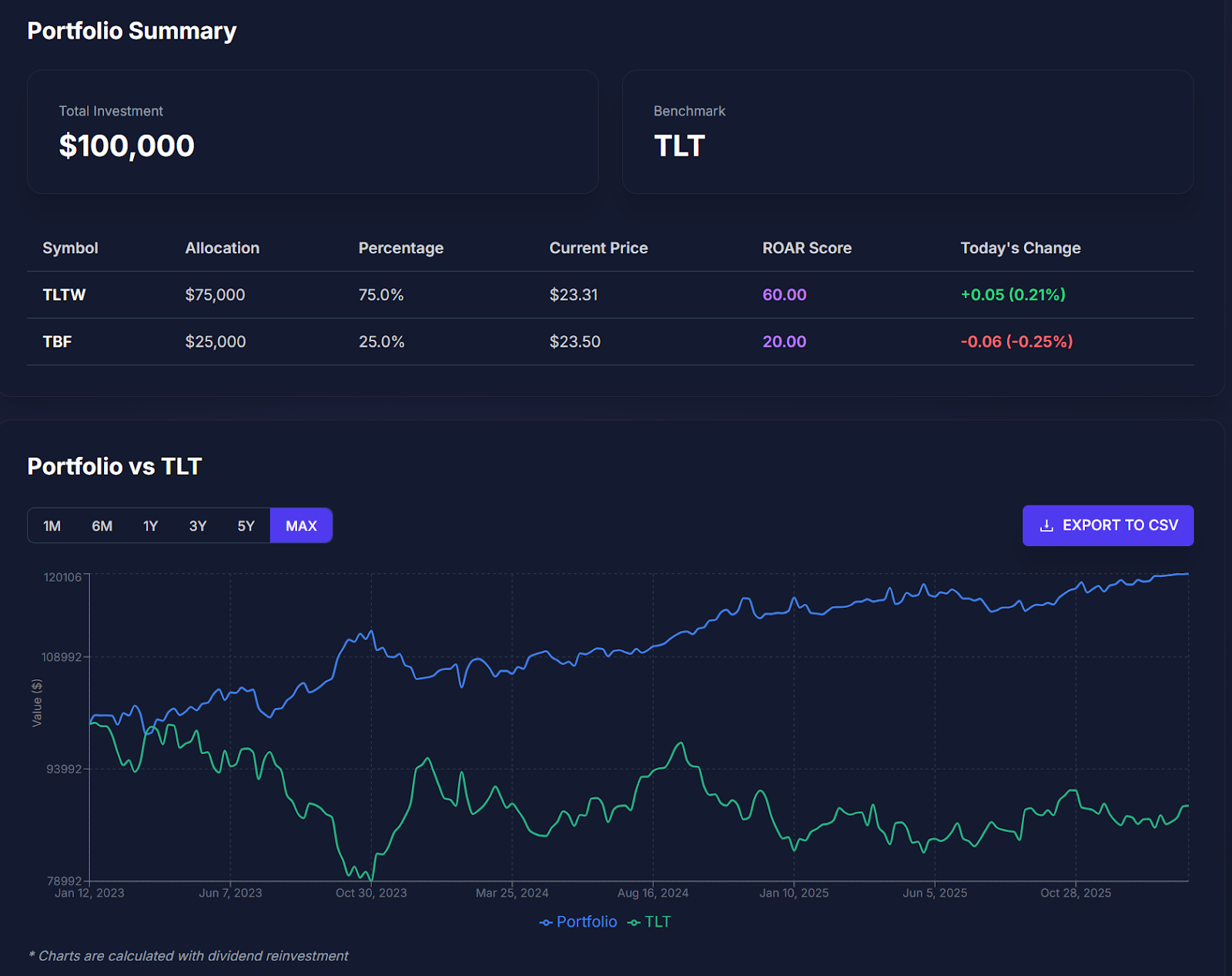 I applied the ROAR scores for TLTW and TBF over the past three-plus years, and created a mechanism to automatically calculate the weightings for the two ETFs at any point during that time. Then, I strung the returns together, shown below.