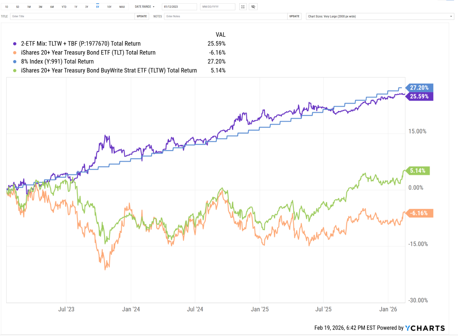 Finally the graph above looks at that same portfolio but versus TLTW and TLT, as well as comparing it to a straight-line 8% return. Quite a correlation to the latter.