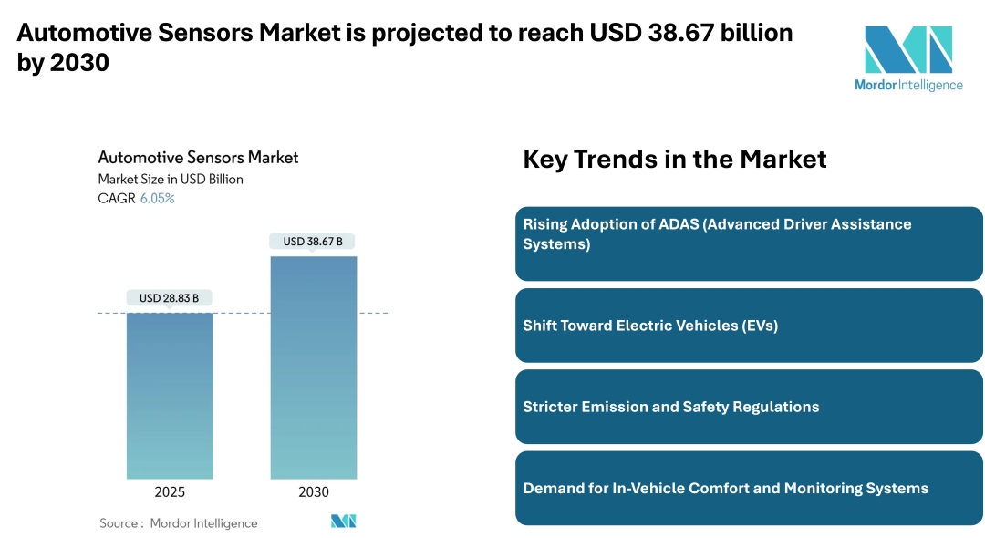 According to a 2025 report on the Automotive Sensors Market by Mordor Intelligence, the market is expected to grow from USD 28.83 billion in 2025 to USD 38.67 billion by 2030, registering a CAGR of 6.05% during the forecast period.