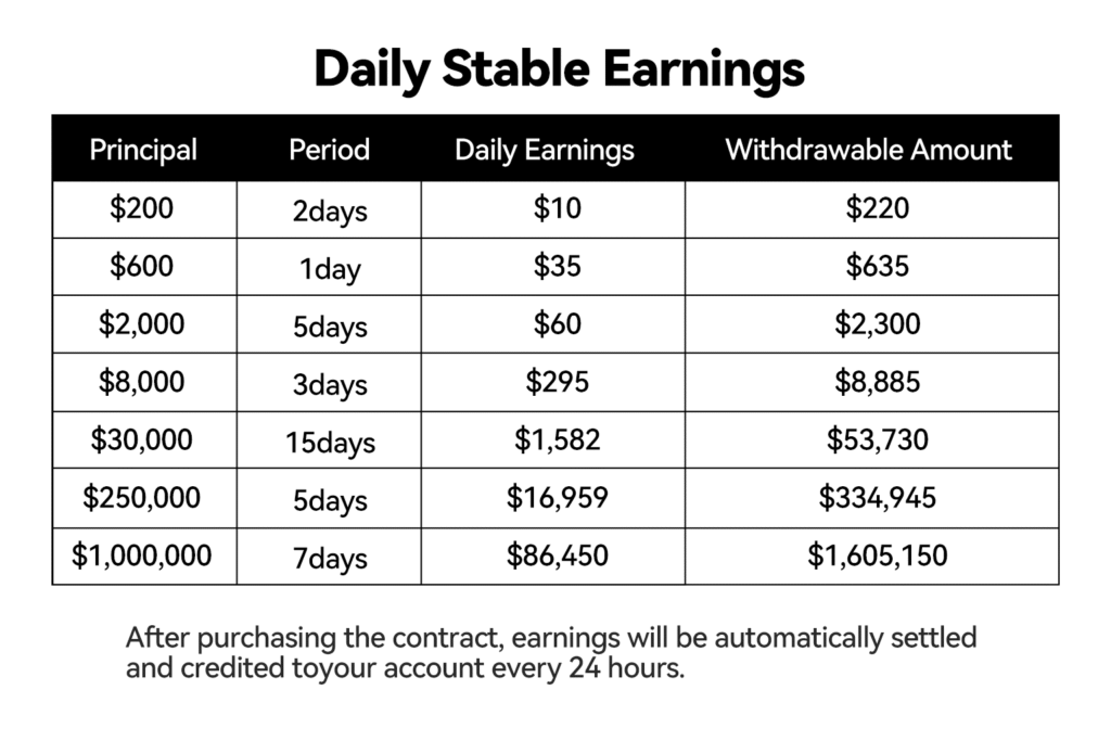 - Automatic settlement of contract profits every 24 hours, requiring no manual intervention. The dashboard allows real-time viewing and withdrawals.