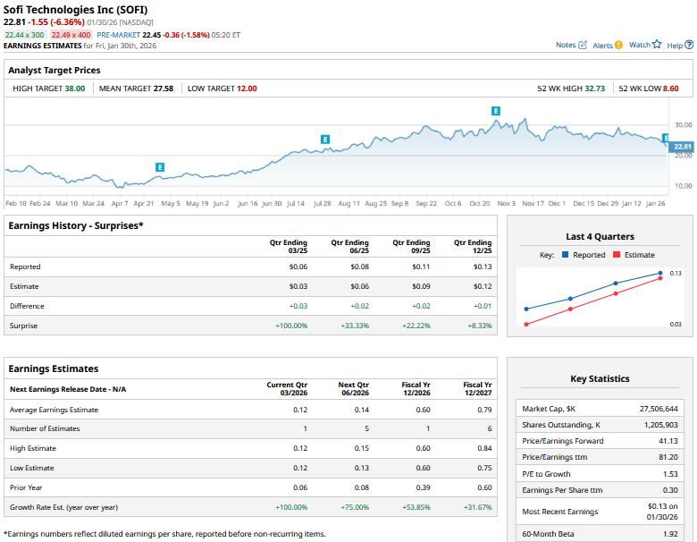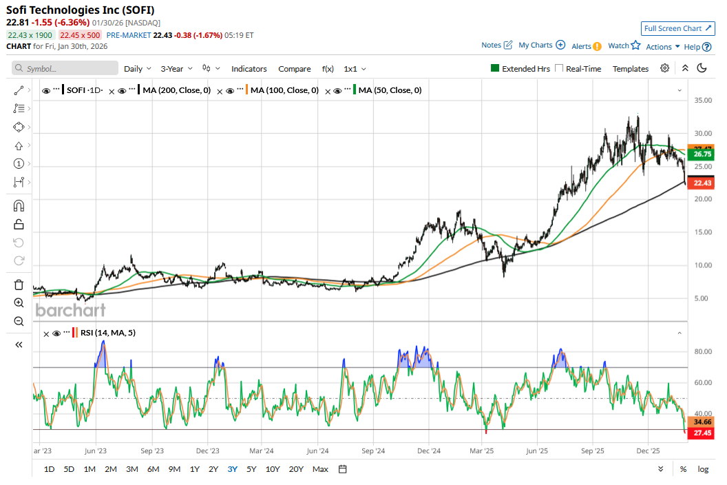 SoFi (SOFI) has outperformed markets handsomely for the last three years, but shares have looked weak in recent weeks. SOFI stock is down 19% year-to-date (YTD) and has lost more than 30% from its record highs hit in November. The selloff only gained traction last week despite a better-than-expected fourth-quarter 2025 earnings report.