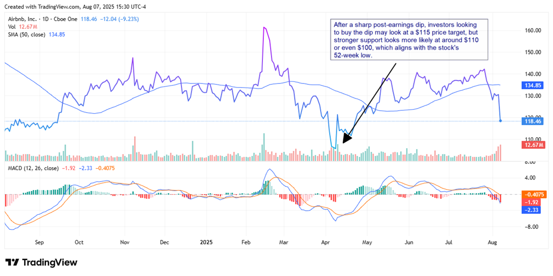 The post-earnings sell-off has given investors the potential for more upside in ABNB stock. The consensus price target of $143.07 provides about 20% upside. However, several analysts have lowered their price targets since earnings. Investors looking to buy the dip may look at a $115 price target, but stronger support is more likely to be around $110 or even $100.