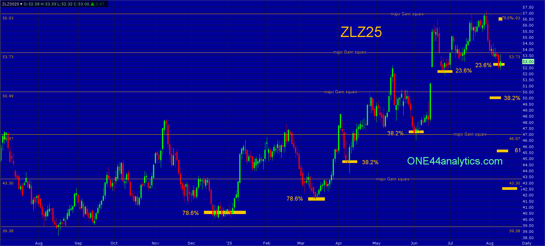 There were two setbacks that held 78.6% retracements  on 12/18/24 and 3/13/25, when following the ONE44 78.6% rule we know this is where a lot of bull markets start. The next two setbacks held 38.2% retracements on 4/9/25 and 6/3/25, holding this level shows the market has a trend. The setback on 6/26/25 held 23.6% a very strong sign and was stopped on the high by the 56.93 major Gann square.Â