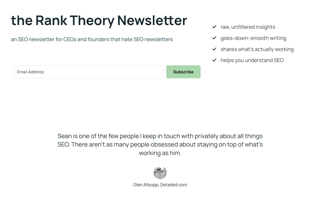 Rank Theory stands out in the crowded SEO landscape by delivering actionable strategies in a "goes-down-smooth" writing style that makes complex topics accessible and engaging. Subscribers gain practical knowledge on navigating Google algorithm updates, content optimization, link-building tactics, and emerging trends like AI-driven search. Whether you're scaling a startup or leading an enterprise, this newsletter equips you with the tools to boost online visibility without the overwhelm.