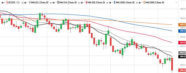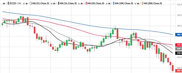 Looking at the damage corn did on the weekly charts in today’s trading session, we have weekly resistance at the $4.00 level and last week high of 412 ¾. Moving average resistance at (427 ¾) which is the 14 day and (436) the 21 day. December corn is now on its 4th week of being lower in a row. (see chart below)