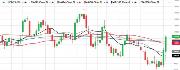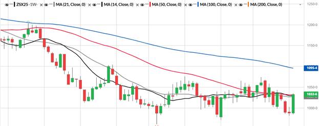 Looking to buy the 1050-1100 call spread in November beans for 10 cents. Would need a break to around the 1020 area in the futures to pick those up.