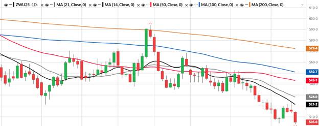 Wheat followed corn lower on the day after the USDA number and made a new contract low of 503 ¼ and settled at 505 for the September contract. The psychological $5 level is approaching and we will see if there are any sell stops below that level. Looking at the daily moving averages for Sep wheat the 14 day is at (521 ¼) and (528) for the 21 day (see chart below) Last weeks high was 523 ¼ which is also acting as resistance.