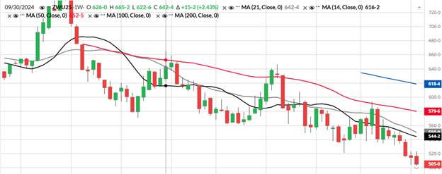 The USDA did decrease ending stocks in today’s report, they came in at 869 compared to 890 million bushels. They left the yield relatively unchanged from July with just a slight increase from 52.6 to 56.7. With wheat following corn today we will see if we get below the $5 level and how its acts below there.