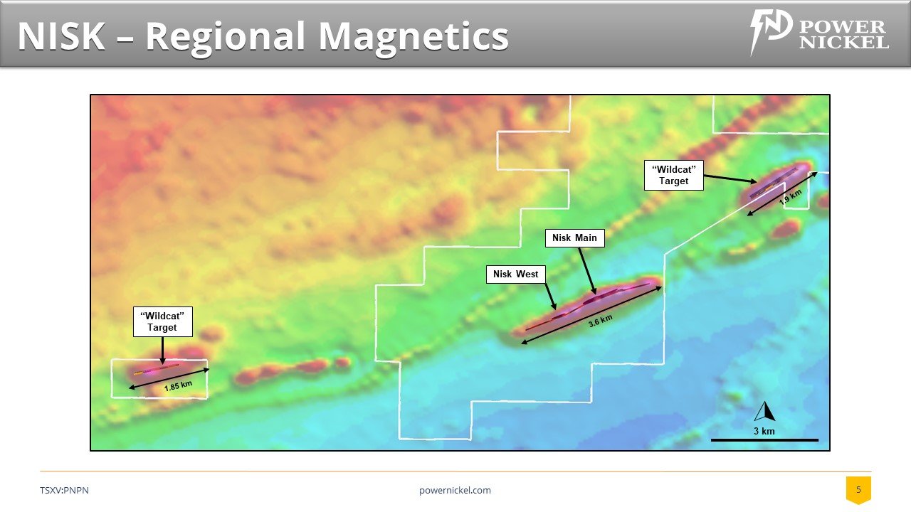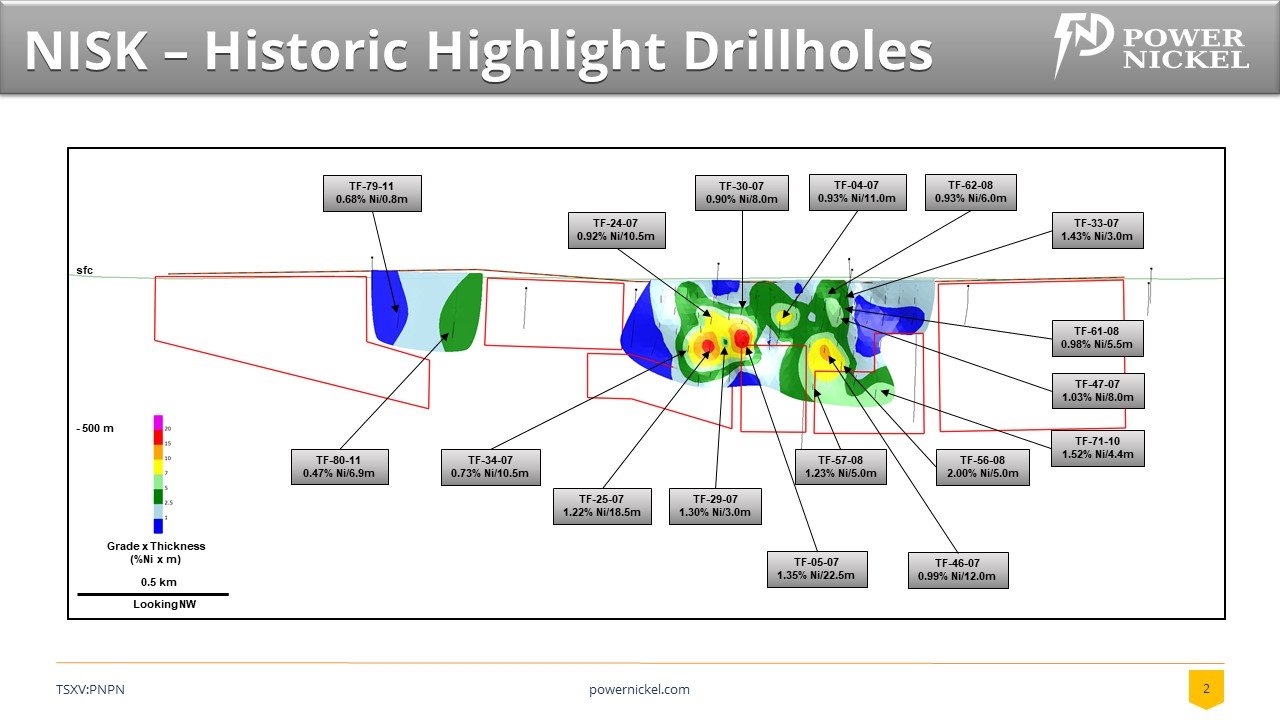 While Nickel Sulphate discoveries globally tend to come in clusters the focus of the initial Power Nickel campaign will be drilling on the Nisk Main target and the Nisk West target where the previous exploration had identified mineralized high-grade nickel zones. In the future, it is anticipated that Power Nickel will test the east and west "Wildcat Targets". In the picture below we highlight some of the high-grade intercepts identified from the historical drilling on the project.