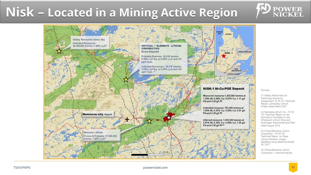 On February 1, 2021 Power Nickel (then called Chilean Metals) completed the acquisition of its option to acquire up to 80% of the Nisk project from Critical Elements Lithium Corp. (CRE:TSXV)