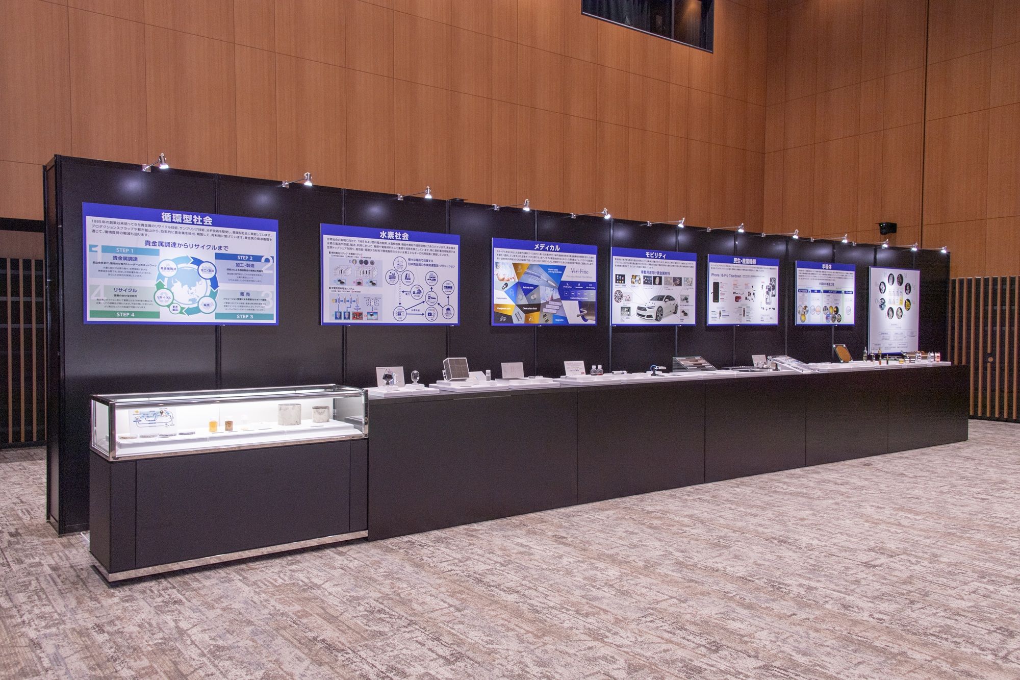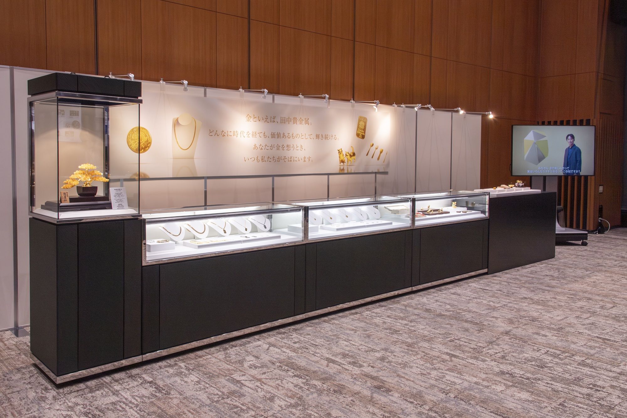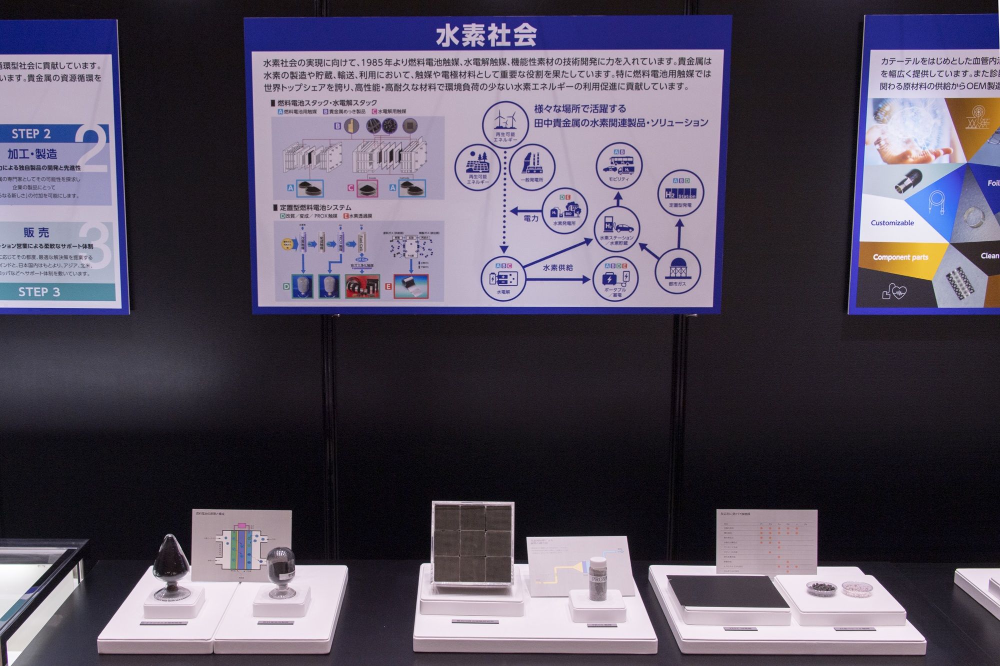 The event site also had a timeline of the Group's 140-year history, graphs of changes in gold prices released by TANAKA, exhibitions of products and services offered by the Group in the retail business segment, industrial precious metal products, and industrial precious metal technologies.