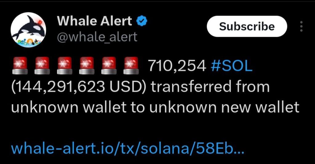 Whale accumulation has continued to increase in the ecosystem, suggesting confidence in SOL’s uptrend. A few hours ago, Whales_alert reported that 710,254 SOL tokens worth over 144 million were transferred from an unknown wallet to an unknown new wallet.
