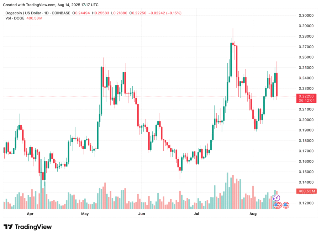 The Dogecoin price has steadily formed higher lows since June 2022, establishing an ascending support trend line. The breakout above $0.22 in July 2025 marks a pivotal moment, signaling potential for further upward movement. Current consolidation indicates DOGE is preparing for another push toward $0.43.