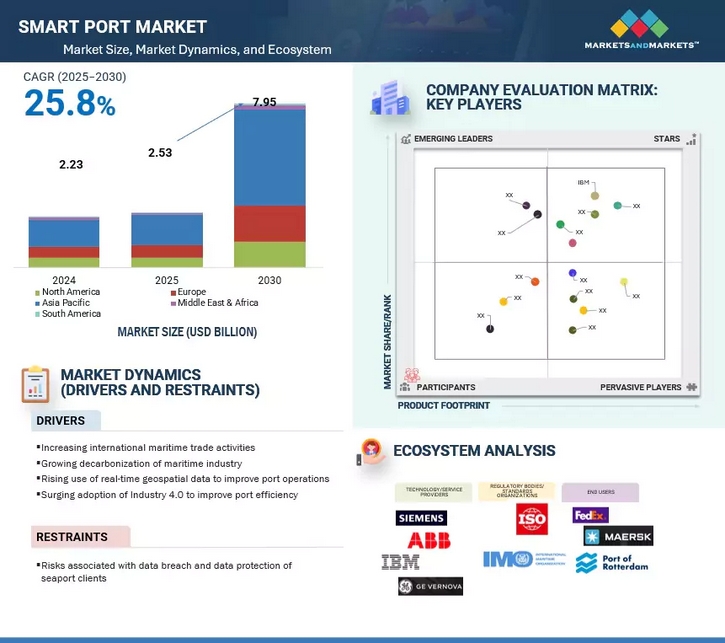 According to a research report "Smart Port Market by Technology (IoT, Blockchain, Process Automation, AI), Throughput Capacity (High, Medium, & Low Throughput Capacity), Port Type (Seaports, Inland Ports), Element, and Region - Global Forecast to 2030", the smart port market is projected to reach USD 7.95 billion by 2030 from an estimated USD 2.53 billion in 2025, at a CAGR of 25.8%. The smart port market is constantly growing due to the increasing attention to improving port efficiency, safety, and environmental sustainability, as well as the growing volumes of international trade and cargo flows. This development is also encouraged by the increased fears of port congestion, carbon emissions, and the efficient operations of logistics. Modernization of digital technologies has become vital, as global supply chains experience a bundle of pressure from a rise in e-commerce, changing trade behavior, and the need for real-time data transparency. The predicted maintenance, the optimal management of the traffic of the vessels, and the efficient control of the containers, with the help of smart port solutions, which include AI-powered cranes, IoT-enabled sensors, a digital twin platform, and a blockchain-based documentation system, reduce the turnaround time, decreasing the cost of operation and increasing safety.
