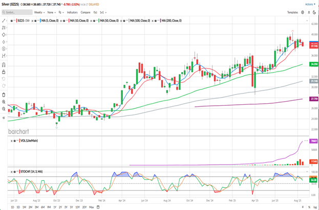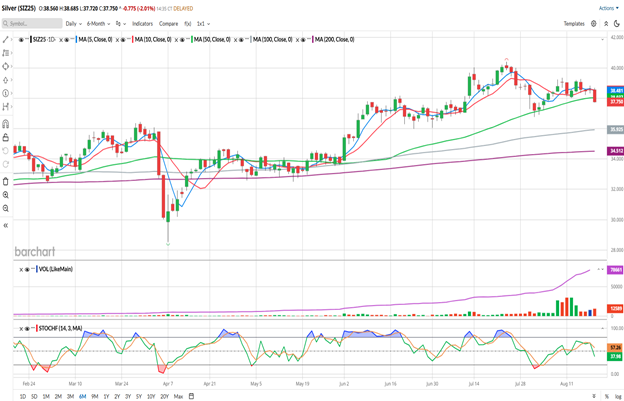 Aggressive and well-margined traders may do well to consider establishing short futures positions. There are mini and micro versions of Silver, if the full-size contract is too much for your account or risk tolerance, with the micro contracts offering significantly more volume and liquidity that the mini. (SOZ25 is the symbol on Barchart) Depending on where you choose to enter, a risk/reverse buy stop at or above yesterday’s high (38.830) may be a good idea. Potential targets, or support levels, may be found near the July 31st low of 36.770, the late June lows near 36.000, which corresponds, coincidentally, with the 100-day moving average, which is at 35.889 today. I don’t think the 200-day at 34.510 is in play yet, but that also corresponds with the highs late in May.